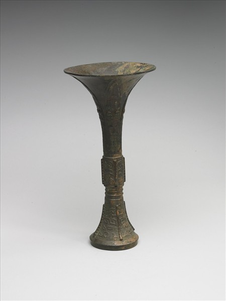 觚,侈口,直筒腹,圈足,腹、足皆有棱脊。脰飾獸面紋、雲雷紋為地,腹及足皆飾獸面紋、雲雷紋為地,腹與足交接處飾弦紋。