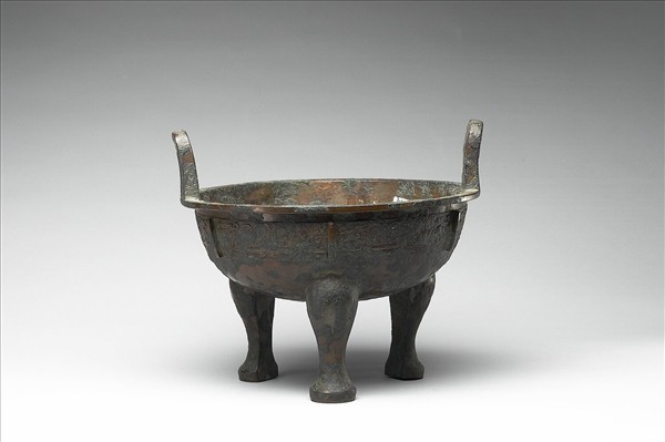 圓鼎,盤口,立耳,蹄足。腹飾夔龍紋,以六道棱脊區隔。器內有銘六行。