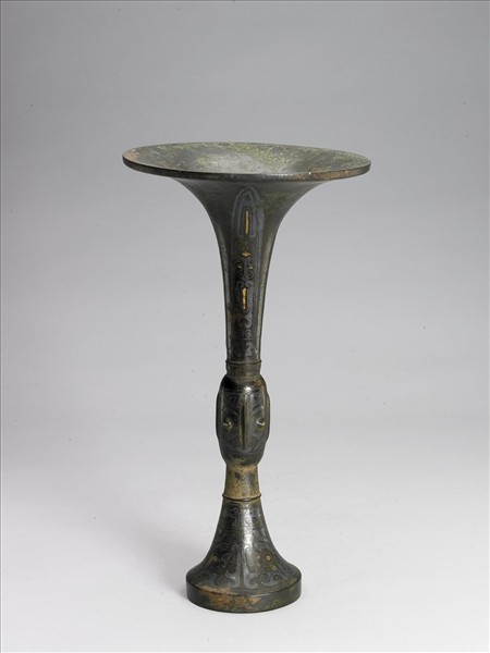 原藏於奉天行宮。腹部纖細,脰部裝飾蕉葉紋,腹部與圈足裝飾獸面紋。紋飾部位錯銀,局部錯金。觚是商代主要的酒器之一,也是宋代以後較為常見的仿古銅器類,應與觚在晚期作為花器的實用功能有關。以觚為花器的風氣也影響到日本,留下許多來自中國、仿自中國的銅觚。