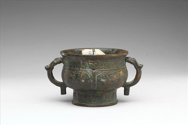 圓簋,侈口、雙耳、圓腹、圈足,耳作獸首形附珥,腹有棱脊。頸飾冏紋、四瓣目紋,中央有小獸首,腹飾獸面紋,足飾四瓣目紋。