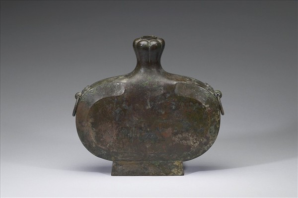 扁壺,蒜頭口、短頸、方圈足,器肩兩側有鋪首銜環。