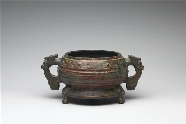 圓簋,子母口、雙環耳、圓腹、圈足,耳做獸首形,下有附珥,圈足下有三小獸面足。口沿有一圈有目竊曲紋飾帶,器腹飾瓦紋,圈足則飾垂鱗紋。
