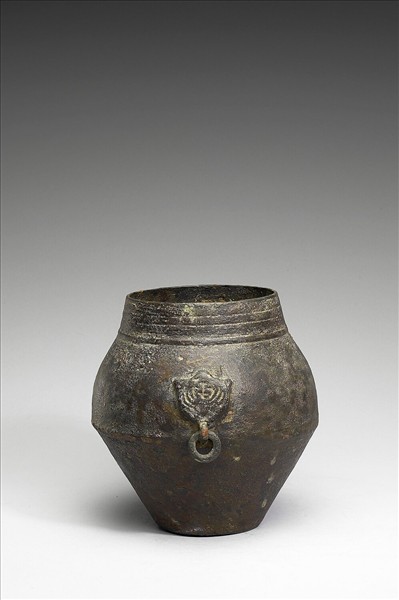 罐,短頸、斜肩、斂腹、平底。器腹兩側有鋪首銜環,頸部飾弦紋三道,腹部則有一道凸弦紋。