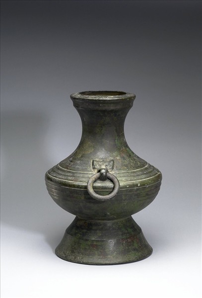 圓壺,折肩、鼓腹、圈足略高,肩上二獸面銜環。肩、腹飾弦紋。