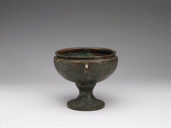 豆,雙環耳、圓腹、高圈足。器腹與圈足飾蟠虺紋,獸眼高凸,並以繩紋區隔紋飾帶。腹內有三鳥紋。