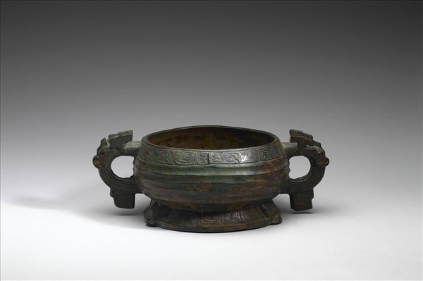 簋,斂口、雙耳、圓腹、圈足,耳做獸首形,下有附珥。口沿有一圈有目竊曲紋飾帶,器腹飾瓦紋,圈足則飾垂鱗紋。圈足下三足缺失。
