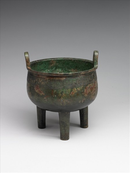鼎,立耳、圓腹、柱足。口沿下飾獸面紋帶,器內壁有銘文。附玉鼎木蓋。