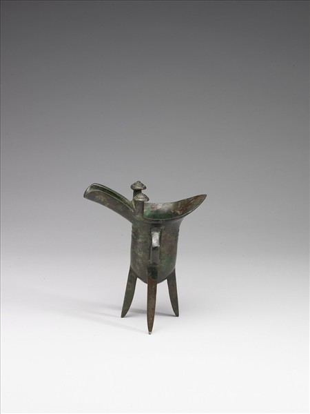 卵形爵,三棱形足、二菌狀柱、環形鋬。腹飾弦紋。