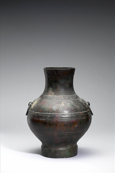 圓壺,長頸、圓腹、階狀圈足,器頸兩側有鋪首銜環,器腹一側破損。肩部與腹部飾凸棱三道。