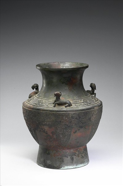 圓尊,敞口、長頸、折肩、斂腹、高圈足,肩部有三立獸。肩部為長尾鳥紋,以雷紋為地,腹有夔龍紋飾帶,下接蕉葉紋。