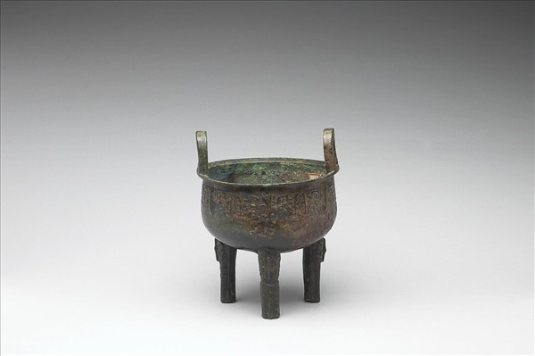 圓鼎,盤口、立耳、柱足,足有棱脊。腹、足飾獸面紋,以雷紋為地。