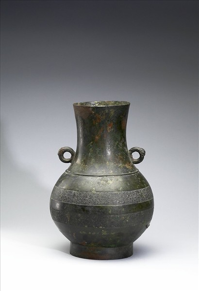 圓壺,長頸、鼓腹、圈足,頸上二獸首環耳。肩飾弦紋,腹飾獸帶紋。腹部傷破。