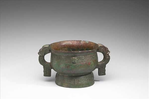 圓簋,侈口、雙耳、圓腹、圈足,耳作獸首形附珥。腹飾夔紋,中央有小獸首,足飾獸面紋。