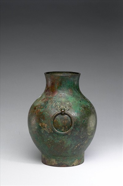 圓壺,曲頸、溜肩、圓腹、高圈足,器腹兩側有鋪首銜環。通體樸素無紋。