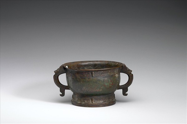圓簋,耳作獸首形附珥,頸、足有棱脊。頸、足飾蛇紋,均以雷紋為地。