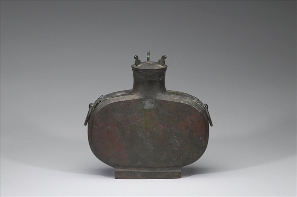 扁壺,附蓋、蓋上有三鈕、直口、短頸、斜肩、扁腹、方圈足,器肩兩側有鋪首銜環。