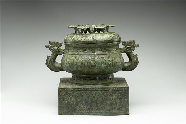 方座簋,附蓋。器蓋帶鏤空捉手,器耳做獸首形,圈足下加一方座。蓋上飾回首夔紋,口沿及圈足有夔龍紋飾帶,腹與方座則飾竊曲紋。