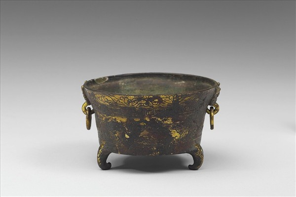 奩,侈口、獸面銜環耳、三足。全器鎏金,器壁飾卷草紋、雷紋、如意雲紋。
