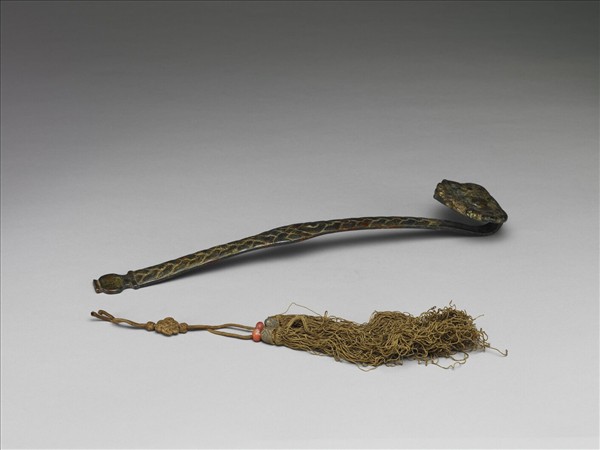 屈柄如意,全器分數段銲接成。如意首為鄂爾多斯式奴鎏金銅腰牌,鏤鑄低首銜物的立獸形,下端另接鑄雲紋使如意首形如芝狀。柄窄長作橋形屈起,飾錯金絲之索紋,柄的中段較寬,索紋交纏若盤長結。柄端另鑄接一瓶飾,瓶身刻太極圖;瓶底象鼻穿,繫線。柄背嵌金線「指揮如意」四篆字。動物紋是北方草原民族最熟悉也最常用的裝飾題材,造形多慓悍活潑。西漢前期墓葬中,曾發現圖案幾乎與本件如意首完全相同的鎏金銅牌,而背面有拱形穿孔,此種腰飾牌通常成對出土於身份較高的墓葬中。本件如意首似將穿孔截去,再銲接下端雲紋及背面平板;柄亦將二件不同時代器銲接一起。此種將不同時代器相接,以重塑新器面貌的造形方式,在宋以後十分常見,目的或在作偽,或僅是復古風氣下增添古意的一種方式。