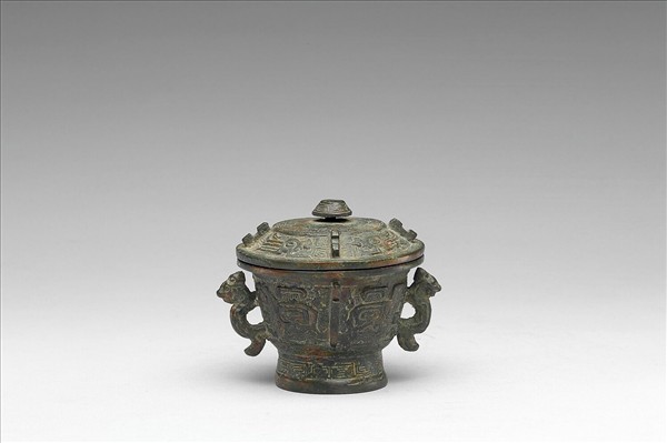 附蓋圓簋,雙耳、圓腹、圈足,蓋鈕作屋形,蓋、腹有棱脊,耳作獸形回首附珥。蓋飾夔紋,腹飾獸面紋,均以雷紋為地,足飾幾何紋。