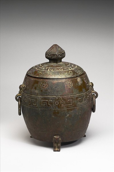 敦,附鈕蓋,角端形鈕,斂口,圓腹,三足,器兩側有鋪首銜環,足做熊獸形。鈕、蓋、與器腹皆有竊曲紋,蓋與口沿處有花瓣紋,器底部有變形蕉葉紋。