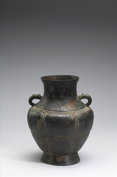 圓壺,盤口,短頸,雙環耳,折肩,斂腹,圈足。器頸有陰刻蕉葉紋,器腹為圜絡紋,以陰刻勾連雲雷紋為地。