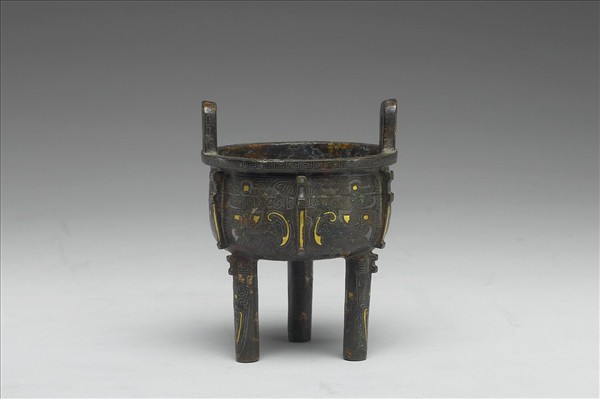 圓鼎,盤口,立耳,柱足,腹有棱脊。口沿、耳飾雷紋,腹飾獸面紋,足飾蟬紋。主體紋飾錯金銀。器內有銘。