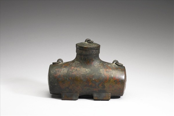 榼,子母蓋,蓋附環鈕,器腹為橫圓筒形,腹上兩側有環耳,下有方足。