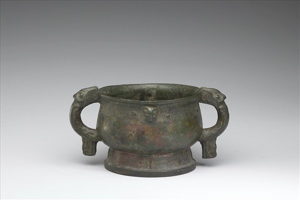 圓簋,侈口,雙耳,圓腹,圈足,耳作獸首形附珥。頸飾獸面紋,中央有小獸首,足飾獸面紋,均以雷紋為地。器內有銘。