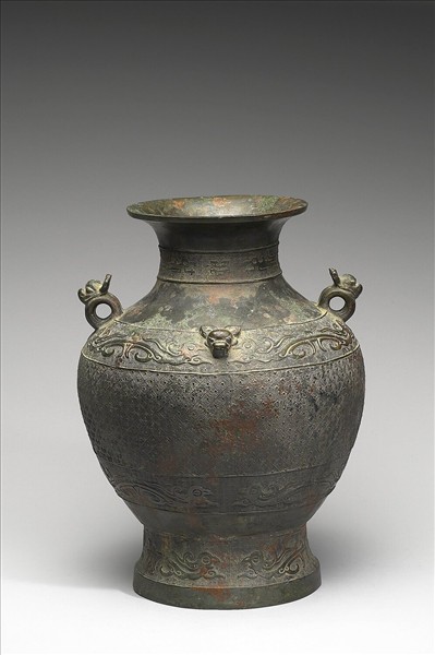罍,敞口,束頸,斜肩,小環耳,斂腹,階狀圈足,耳作獸首形,器肩有小獸首。頸、肩、器腹下方與圈足飾夔紋帶,以雷紋為地,器腹有幾何菱格紋。