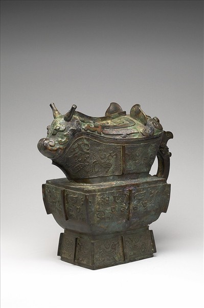 動物形觥,全器為方形,方鼓腹,圈足,獸形把,下有垂珥,有棱脊,腹下方有破損。蓋前後各飾獸首,中央有夔紋。腹飾獸面紋,頸與圈足有鳥紋,以雷紋為地。蓋內有銘文四行。