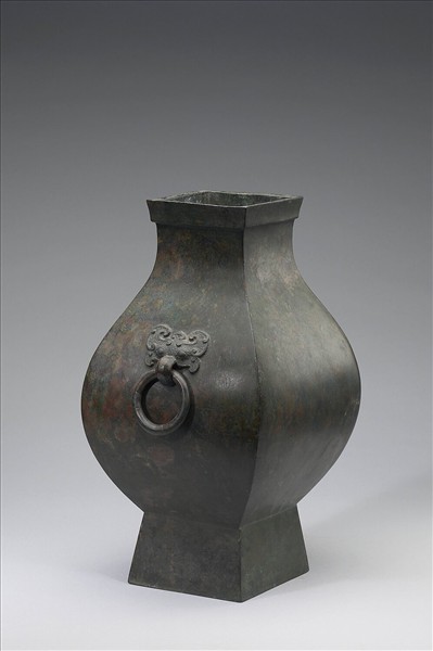 鈁,盤口,短頸,斜肩,鼓腹,高圈足。器肩兩側有鋪首銜環。
