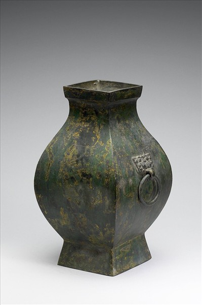 鈁,盤口,短頸,斜肩,鼓腹,高圈足。器肩兩側有鋪首銜環。
