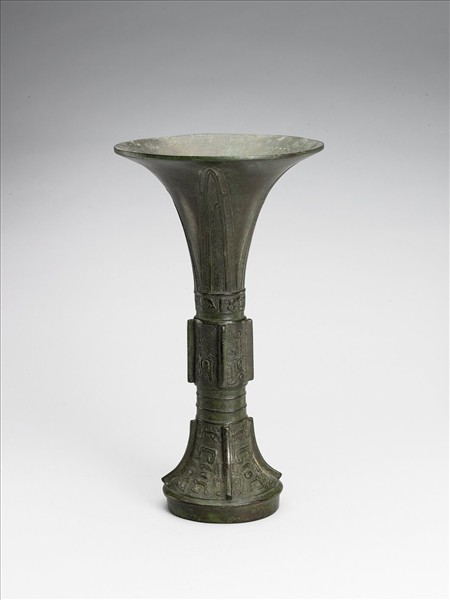 觚,侈口,直筒腹,圈足,腹、足皆有棱脊。脰飾夔紋,下飾蛇紋,雲雷紋為地,腹飾獸面紋、雲雷紋為地,足飾夔紋,下飾獸面紋、雲雷紋為地,腹與足交接處飾弦紋。