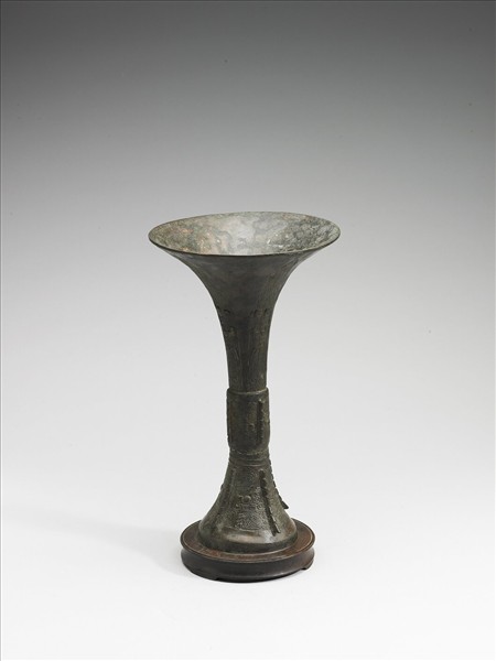 觚,侈口,直筒腹,圈足,腹、足皆有棱脊,附木座。脰飾三角形獸面紋、雲雷紋為地,腹、足皆飾獸面紋、雲雷紋為地。