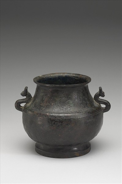 瓿,撇口,短頸,斜肩,雙耳,鼓腹,階狀圈足,耳作獸形。