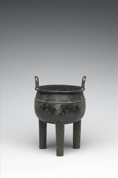 圓鼎,盤口,縮頸,立耳,柱足。全器平素,腹有凸棱。