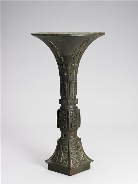 原藏於奉天行宮。器表的紋飾鑄造尚稱精準,脰部飾獸面組成的蕉葉紋,下緣為一周蟬紋;腹部、足部均為獸面紋,圈足上方還有一周夔紋。紋飾雖仿自商代,但細節簡化許多。然而方足圓觚的造型卻為商代銅觚所未見。腹部也鑄有十字孔。類似的方足圓觚也見於明晚期潞國鑄器。觚為宋代以後最流行的銅器器類之一,可能與其被賦予花器的實用功能有關。除了銅質之外,瓷觚也相當普遍,也有木雕、竹雕、琺瑯作品。