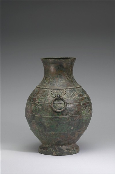 圓壺,盤口,長頸,斜肩,圓腹,階狀圈足,器頸兩側有鋪首銜環。肩部與腹部飾凸棱四道。