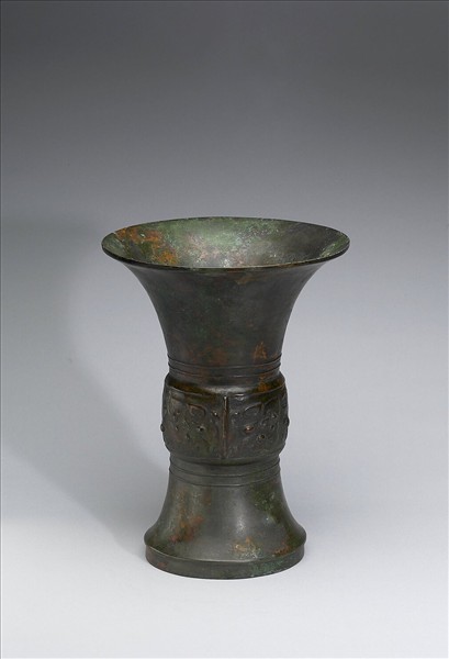 尊,敞口,筒腹,圈足。脰、足各飾弦紋,腹飾獸面紋。