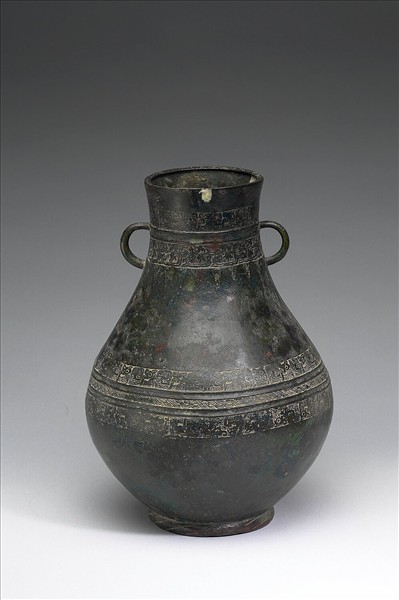 圓壺,直口,短頸,雙環耳,斜肩,圓腹,圈足。頸部與腹部最大徑飾竊曲紋與繩紋。