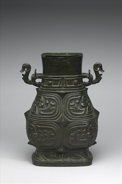 方壺,直口,長頸,雙環耳,斜肩,圓腹,階狀圈足,耳做獸首形。頸部飾簡化竊曲紋帶,器腹滿布有目竊曲紋,圈足則為幾何紋。器內壁有銘文。