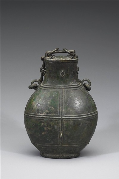 扁壺,附蓋、蓋與壺身以鍊形提樑連接,直口,短頸,斜肩,扁腹,圈足,器頸處有四小鋪首銜環。器腹飾圜絡紋,腹部下方有一單環耳。