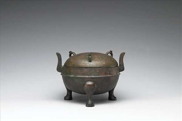子母口,附耳,深腹,蹄足,蓋呈半球形,附半環鈕三個。腹飾弦紋一道。