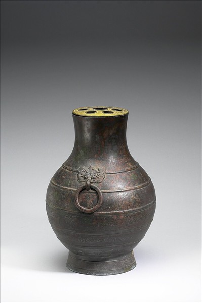 圓壺,直口,長頸,斜肩,圓腹,高圈足,器頸兩側有鋪首銜環。肩部與腹部有凸棱四道,並飾三角形之幾何雲雷紋。附銅膽。
