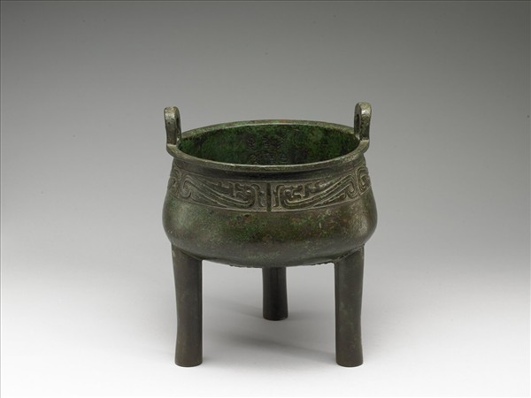 折沿,立耳,垂腹,柱足。口沿下飾回首相背的夔紋三組。器內壁有銘文三行十二字:「桋伯肇作鳥寶鼎,其萬年用享。」