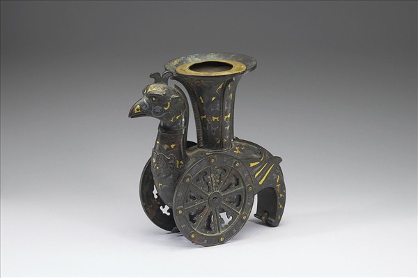全器嵌金銀以鳳鳥為造型,雞形而長尾,昂首直立,尾長著地,足、尾有輪可轉動。背馱一個尊,有棱脊內附膽,與鳥身可分離。尊頸飾蕉葉紋。鳳鳥有冠,頸貼獸面紋,羽翅、尾飾幾何紋。輪飾幾何紋。
