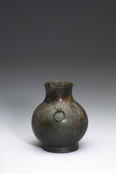 圓壺,短頸,鼓腹,圈足,肩上二獸面銜環。