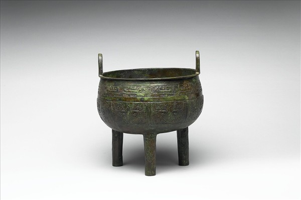 圓鼎,盤口,立耳,腹圓鼓,柱足,附白玉頂木蓋。腹飾兩圈紋飾,上圈為夔紋,下圈為獸面紋,足飾蕉葉紋。