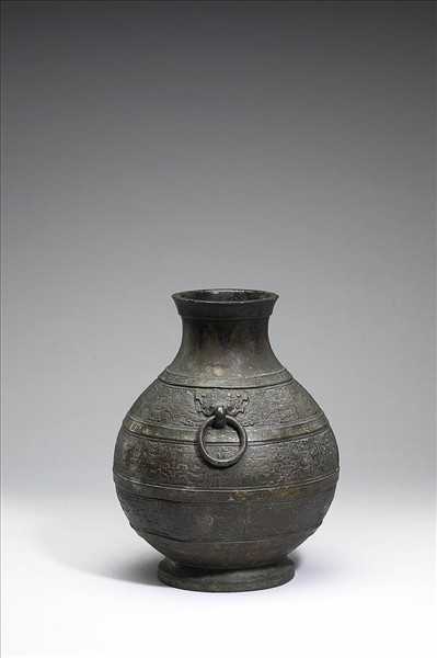 圓壺,盤口,短頸,斜肩,圓腹,階狀圈足。器頸兩側有鋪首銜環,並飾有三角形紋,器腹飾三道蟠螭紋帶。